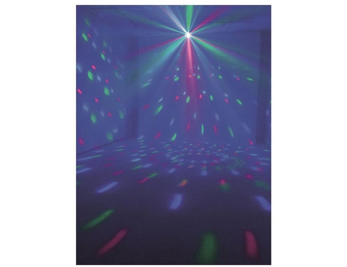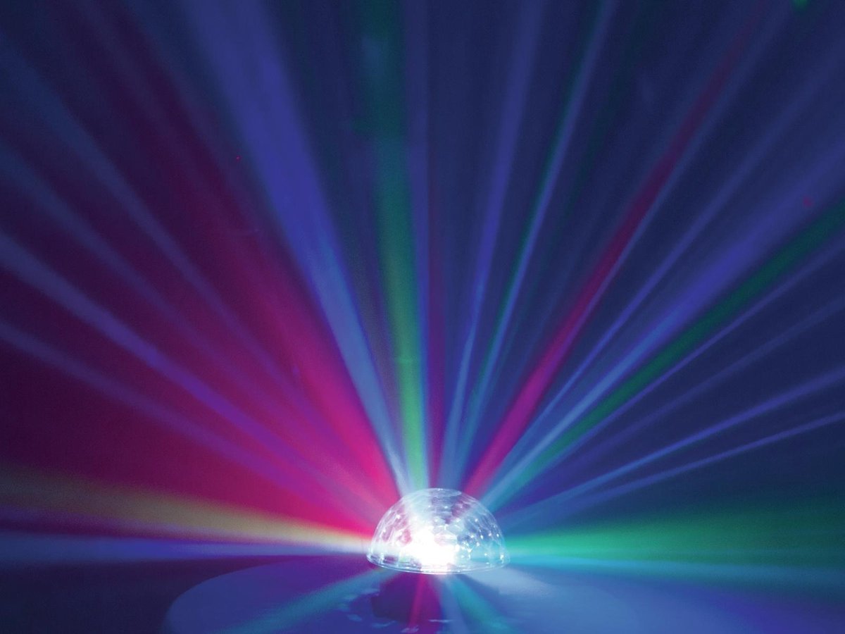 Ongebruikt in originele doos - Helder, gefacetteerd oppervlak zorgt voor unieke straaleffecten - Uitgerust met heldere rode, groene, blauwe, amberkleurige en witte LED's - 10 tot 50 rotaties (180°) per minuut produceren - cirkelvormige lichtspelen - Te gebruiken in stand-alone modus of via DMX- DMX-512-besturing - mogelijk via elke commerciële DMX-controller (bezet 9 kanalen) - Geluidsgestuurd via ingebouwde microfoon - Comfortabele adressering en instelling via bedieningspaneel met 4 - cijferig LED-scherm en vier bedieningsknoppen - Functies: traploze kleurverandering; - kleurvervaging; interne programma's; dimmer, stroboscoopinstellingen, motorrotatie en snelheid - instelbaar via stand-alone modus en via DMX; Master/Slave – Geheugenfunctie - Kunststof behuizing met montagebeugels - Doorvoeruitgang maakt het mogelijk om tot 8 apparaten van - stroom te voorzien - Schakelende voeding voor werking tussen 100 en 240 volt - Aansluitklaar via - netsnoer met geaarde stekker - Voeding: - 100-240 V AC, 50/60 Hz