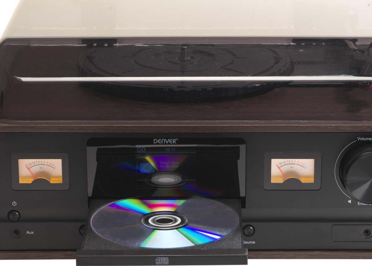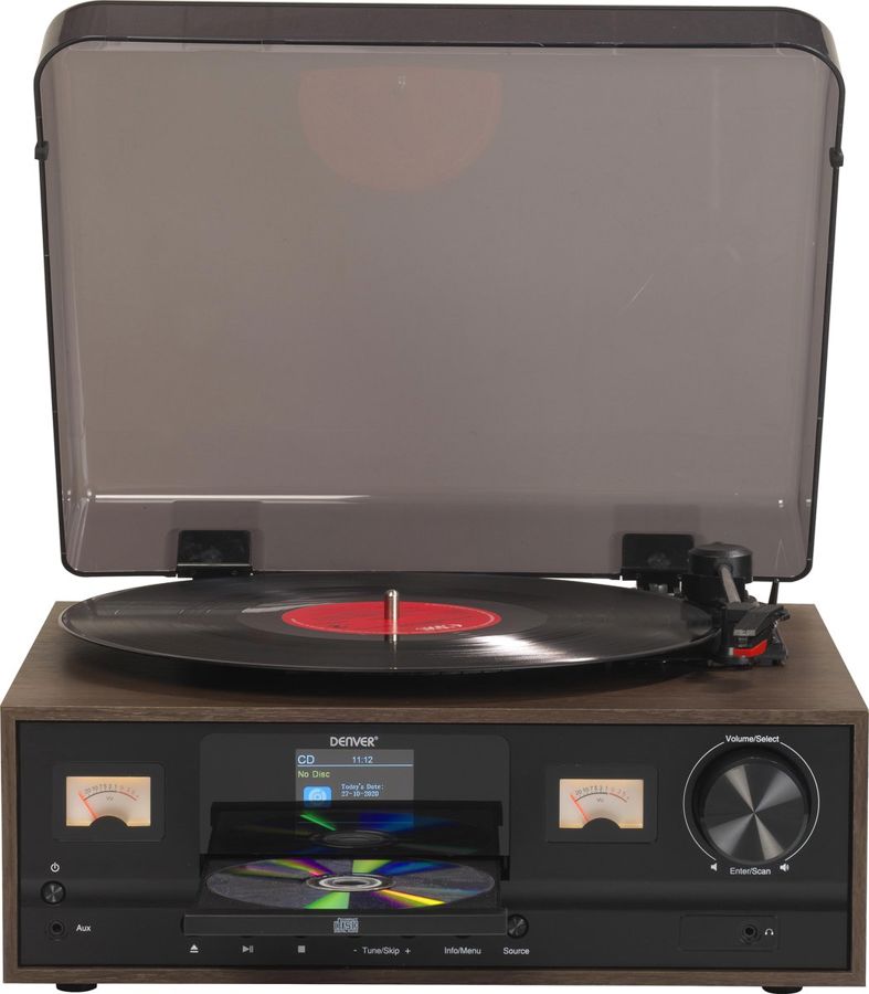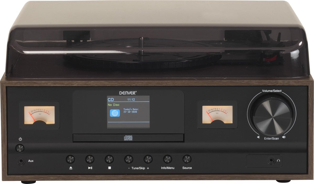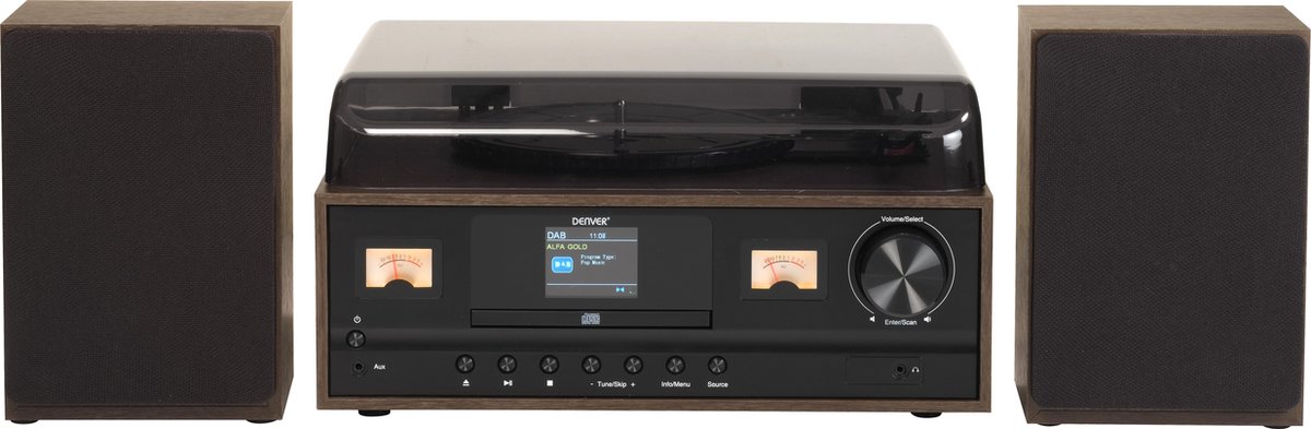 | Ongebruikt in originele verpakking - Geniet van alle luxe van nu in een retro jasje met dit mooie en functionele muzieksysteem van Denver. De platenspeler (pick-up) met radiofunctie en 2 speelse houten speakerboxen is voorzien van: DAB+ - FM radio - CD speler - Bluetooth - 2.4 inch kleurendisplay - 2 x VU meters - 2 x houten 5W speaker - Aansluiting koptelefoon - Aux in - afstandbediening |